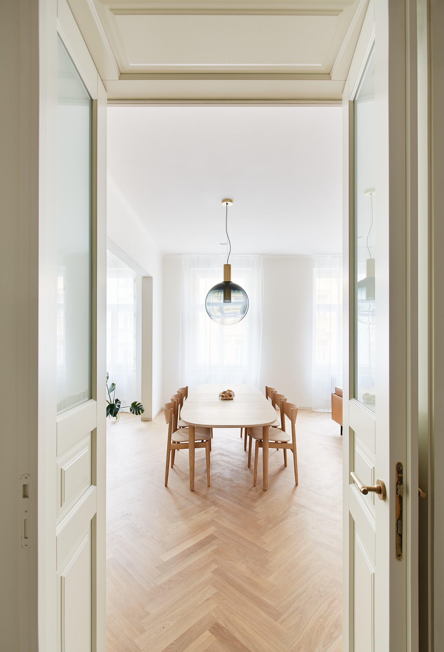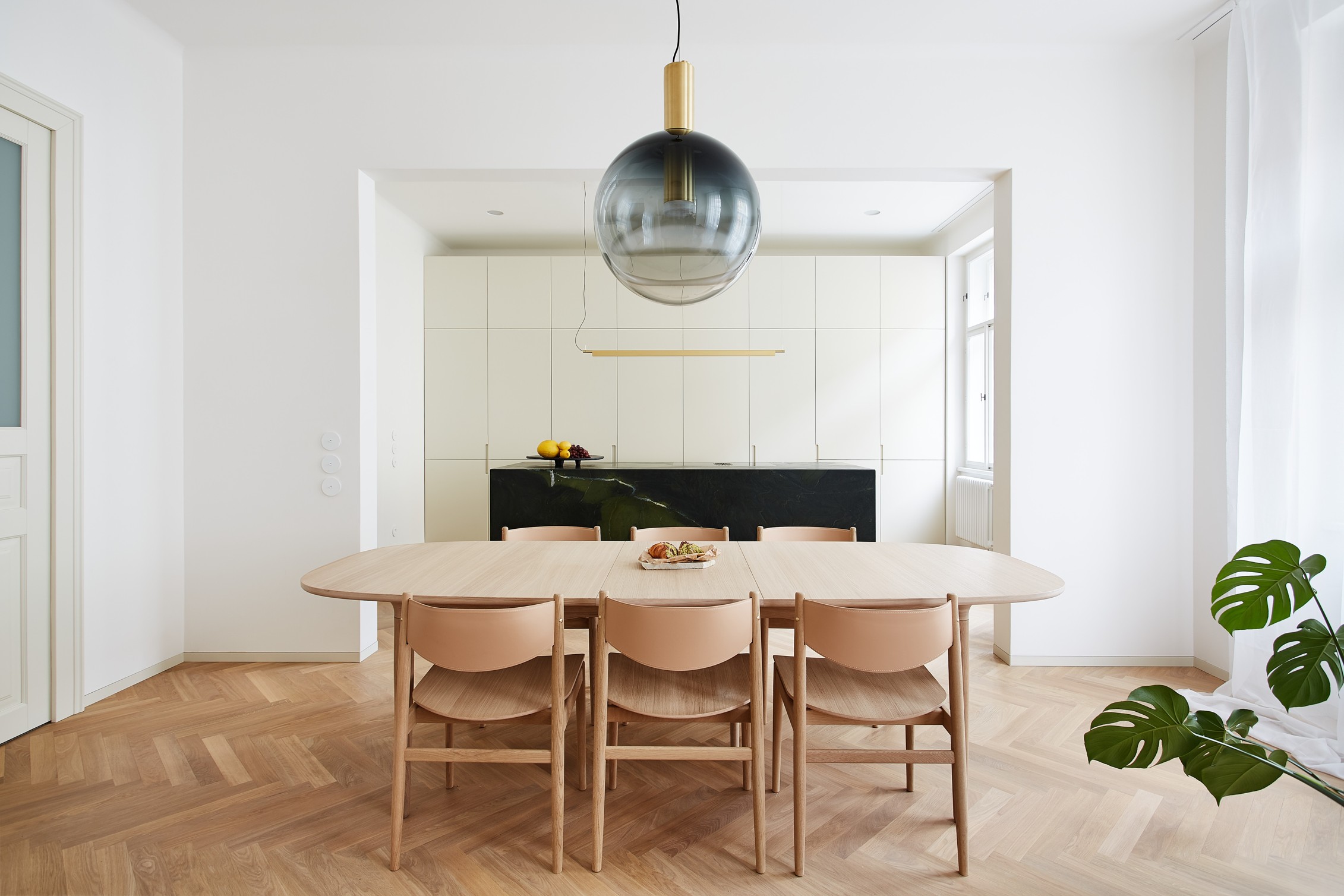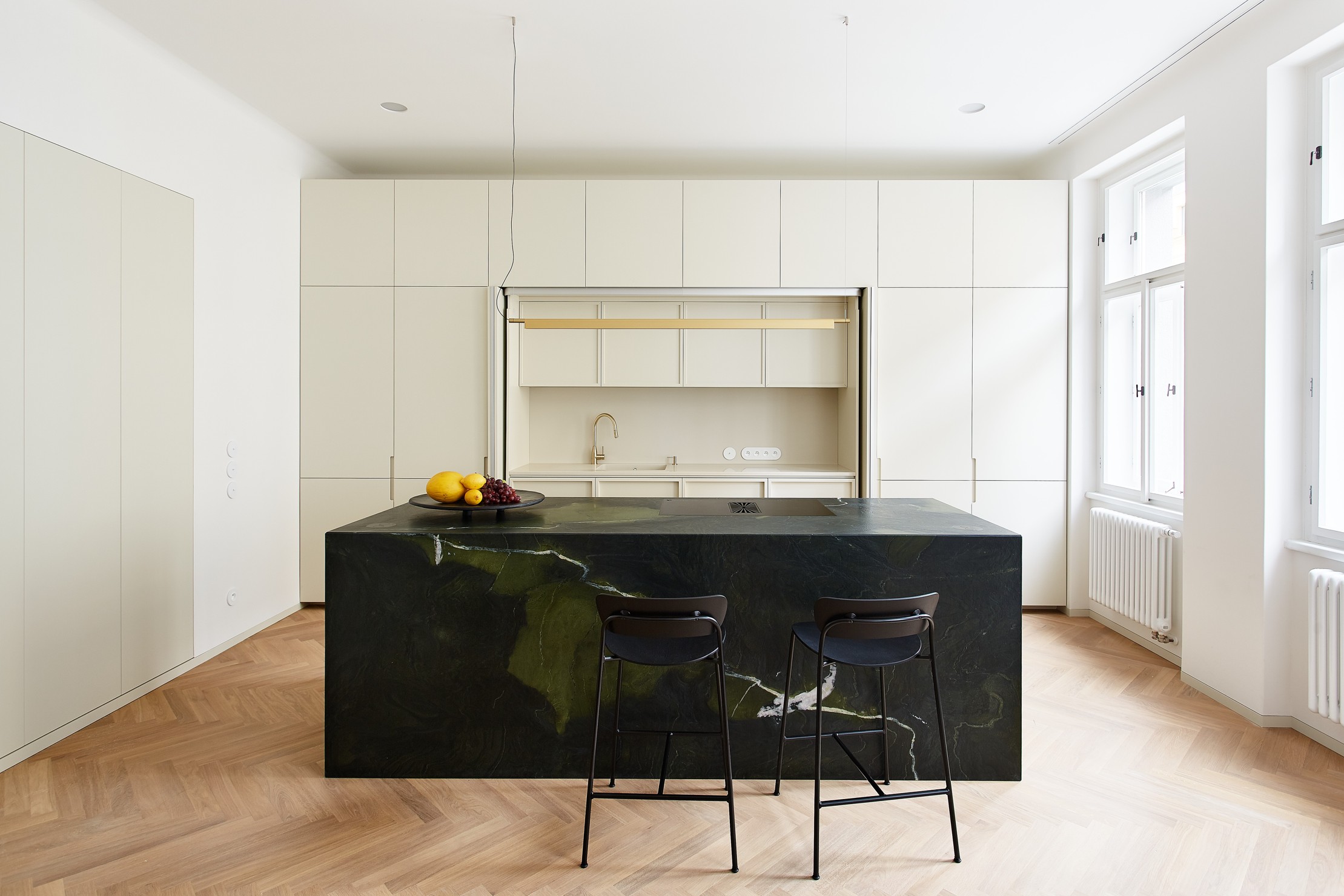 Návrh klade důraz na ušlechtilé materiály a propracované detaily. V bytě se prolíná původní charakter interiéru se současným moderním pojetím. Časově a architektonicky odlišné prvky opticky spojují mosazné detaily, stejně tak shodný barevný odstín slonové kosti použitý například na špaletová okna, dveře a vybrané nábytkové kusy. Obytné místnosti mají dubovou parketovou podlahu, vstupní chodba a koupelny terazzo.