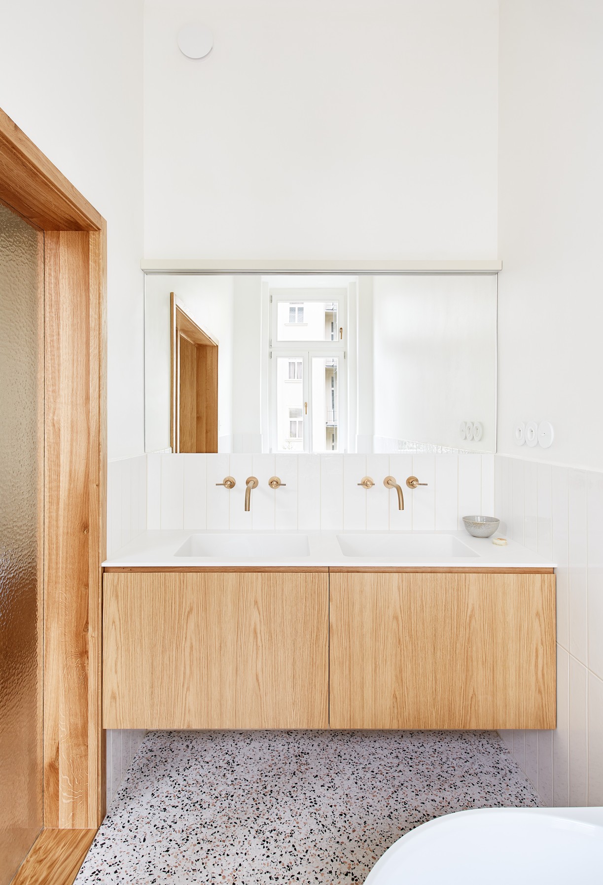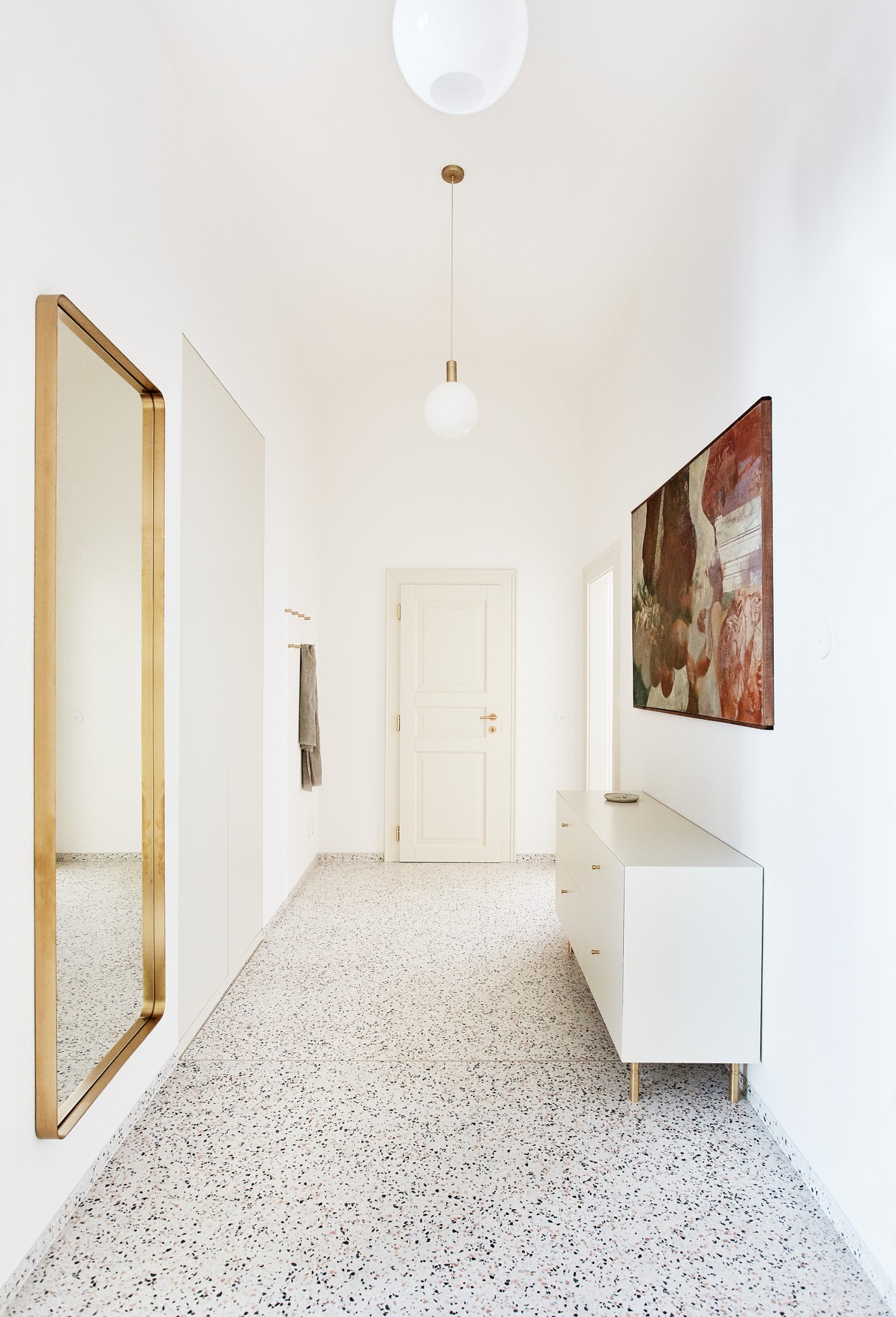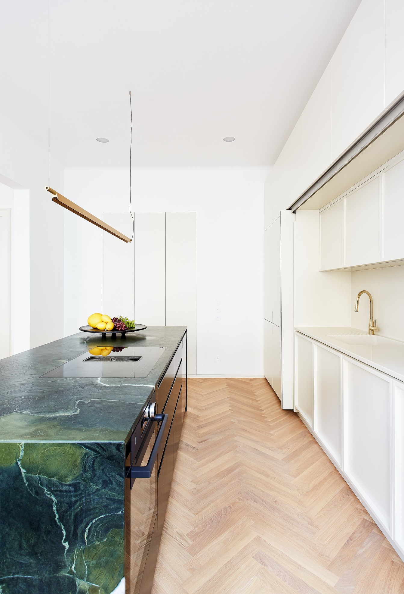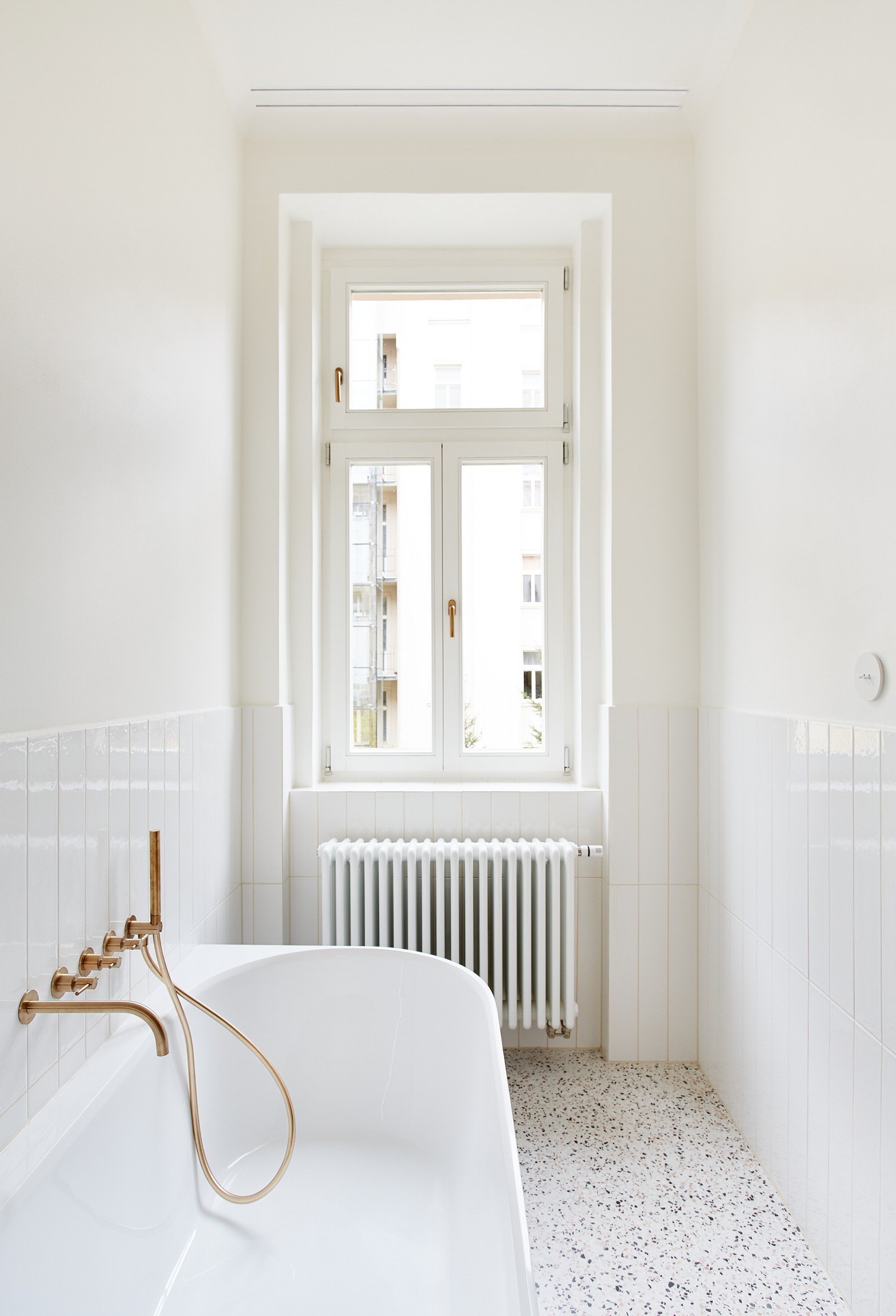 Návrh klade důraz na ušlechtilé materiály a propracované detaily. V bytě se prolíná původní charakter interiéru se současným moderním pojetím. Časově a architektonicky odlišné prvky opticky spojují mosazné detaily, stejně tak shodný barevný odstín slonové kosti použitý například na špaletová okna, dveře a vybrané nábytkové kusy. Obytné místnosti mají dubovou parketovou podlahu, vstupní chodba a koupelny terazzo.