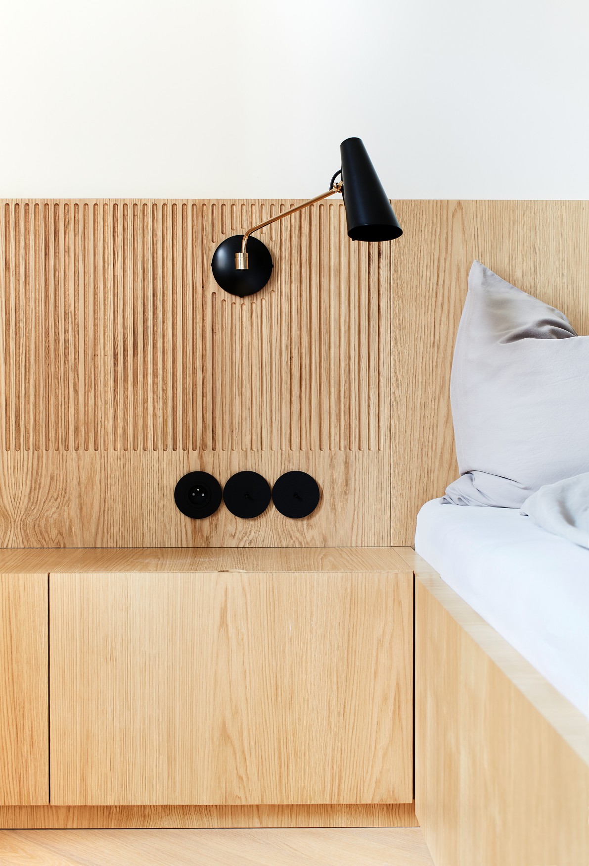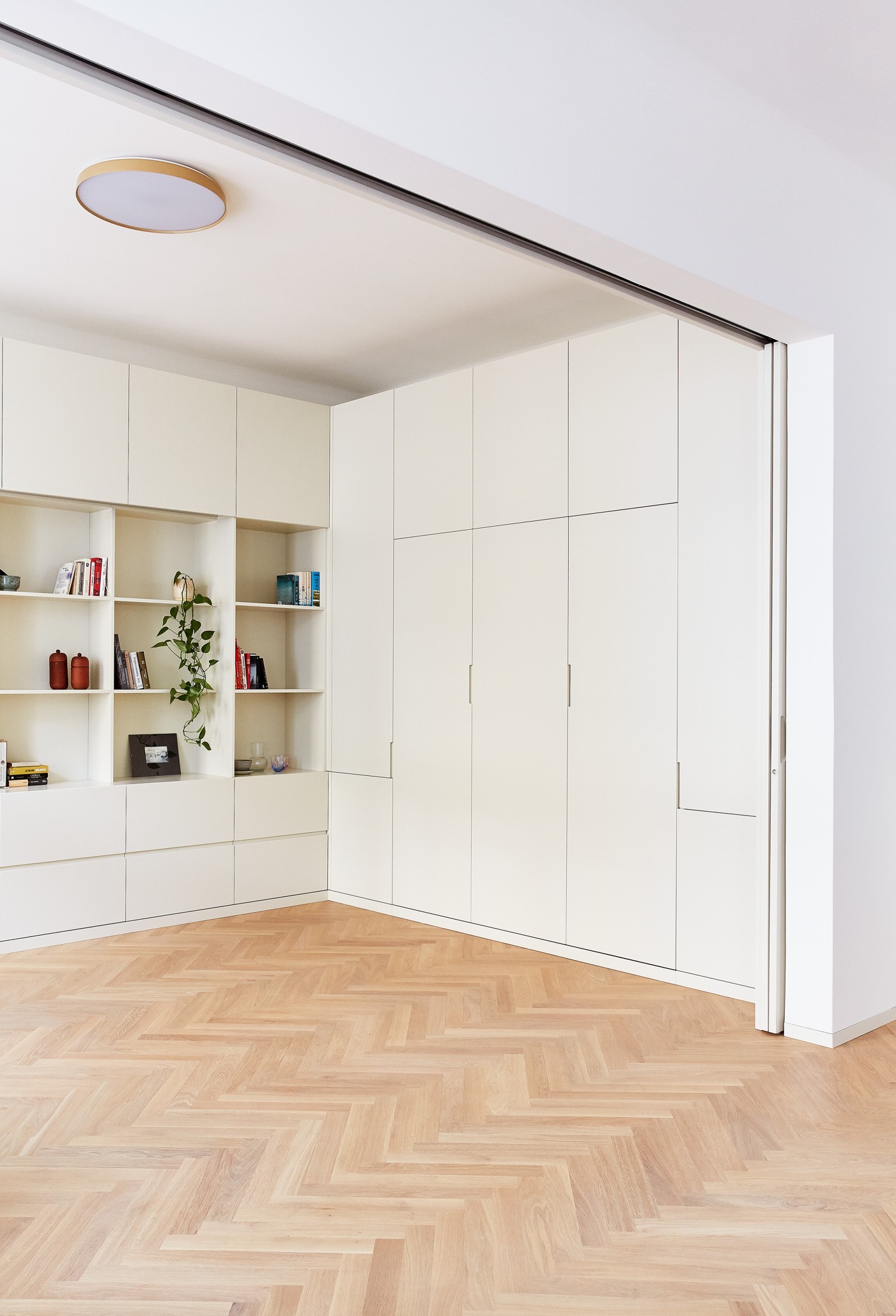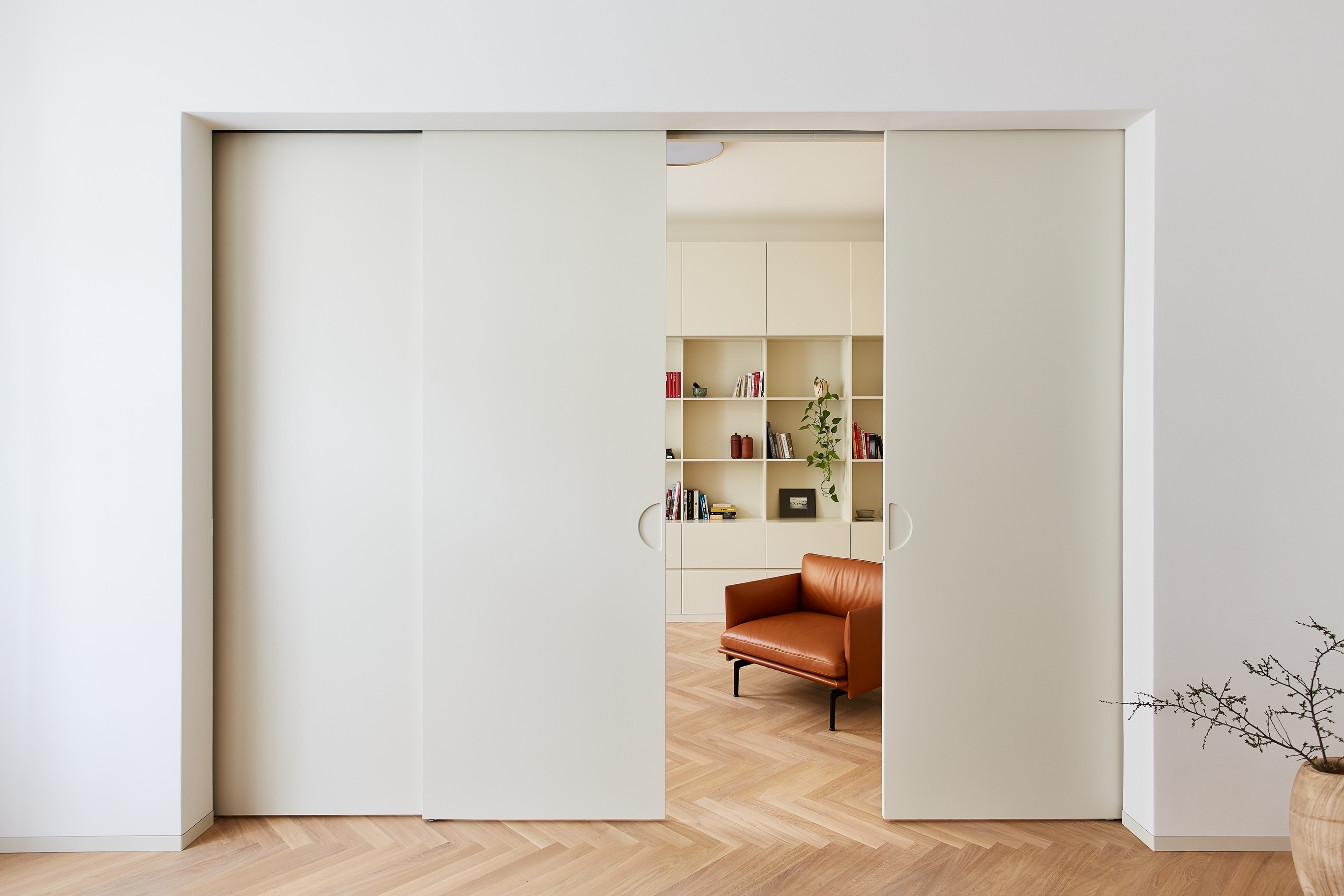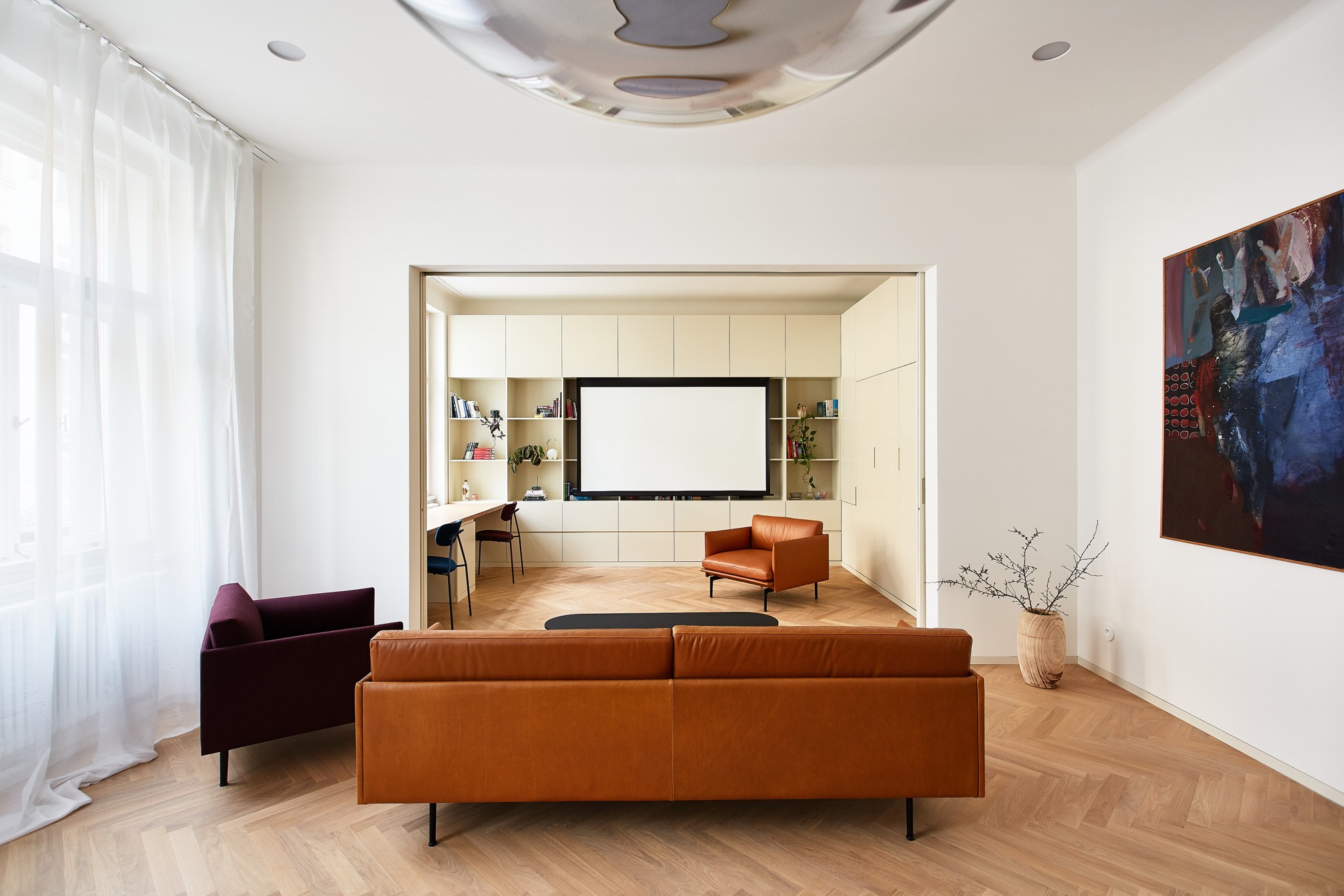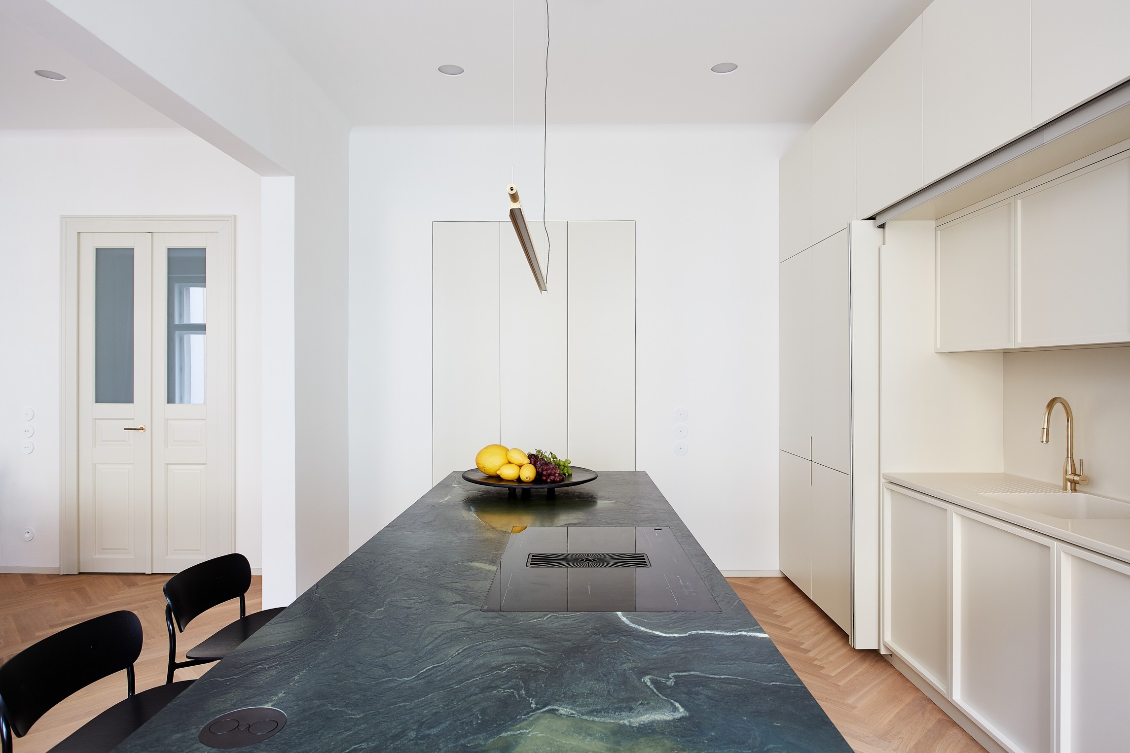 Propojením tří stávajících místností nově proraženou enfiládou vzniká velkorysý obytný prostor, rozčleněný na kuchyni, jídelnu, obývák a oddělitelnou pracovnu. Pracovna může sloužit i jako pokoj pro hosty, vyklápěcí postel zde nabízí místo pro příležitostné spaní dvou osob. Kuchyňská linka na protilehlém konci je uzavíratelným nábytkovým kusem s dominujícím předsazeným ostrůvkem z barevně výrazného kvarcitu. Kruhový stůl uprostřed trojprostoru je pomyslným středobodem celého bytu, osa enfilády se v jeho středu protíná s osou průhledu při příchodu do místnosti. Z centrální vstupní chodby lze vstoupit také do dětského pokoje, toalet a šatny, za kterou je ukryta ložnice s vlastní koupelnou. Ložnice i dětský pokoj se nachází v klidnější zadní části bytu s výhledem do dvora.